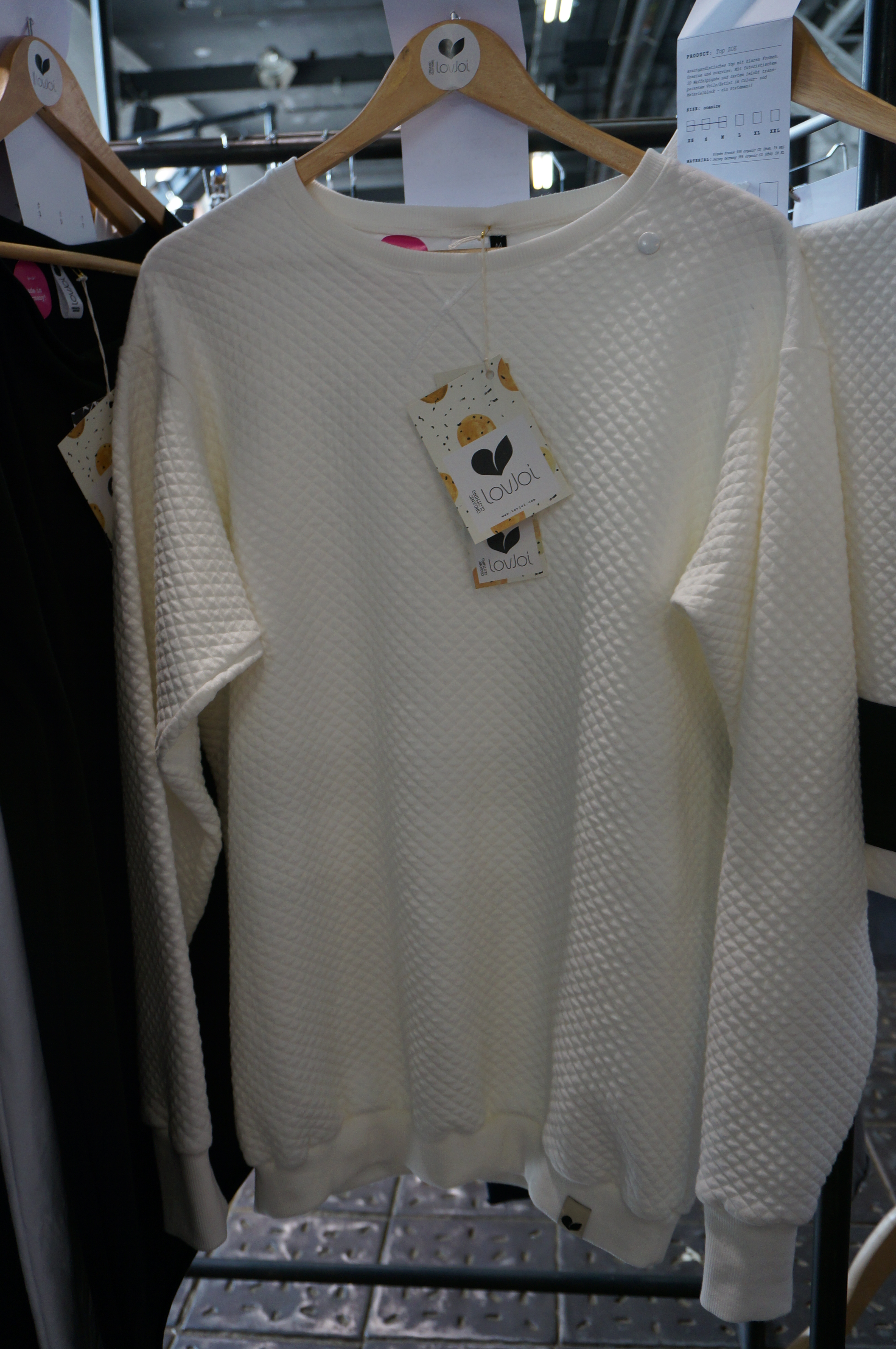 Am Ende eines langen Messetags höre ich eigentlich nur noch auf persönliche Empfehlungen. „Und was hat dir am besten gefallen? Irgendein Label mit unifarbenen Basics?“ Und so lief ich schnurstracks auf den Stand des deutschen Labels Lovjoi zu. Es war die erste Messe für das im August 2014 gegründete Label aus dem Schwabenland. Die Idee kam Verena, Besitzerin eines Bioladens, die privat auf der Suche nach Basics war, die bio, vegan und fair zugleich sind. Und wenn einem nichts so richtig gefällt, was man sieht? Genau, einfach selber machen! Zusammen mit der Modedesignerin Freddy und der Fotografin Elli entstand die perfekte Symbiose namens Lovjoi. Dabei setzt das Dreiergespann auf smartes Design: So können die Männerpullis auch als Kleid und die asymetrisch geschnittenen Oberteile als Kleid, Longtop oder hochgekrempelt als T-Shirt getragen werden. Alle Produkte sind zudem aus GOTS-Baumwolle und werden in Deutschland hergestellt. Die Preise bewegen sich zwischen 29 Euro und 149 Euro. Lovjoi fällt definitiv unter die Kategorie Label-to-watch!